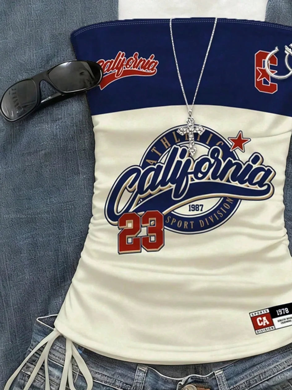 cropped top ,Women's Summer Drawstring Tie Front Cutaway Tapered Tank Top, Fashionable Resort-Fit Sporty Print Strappy Top