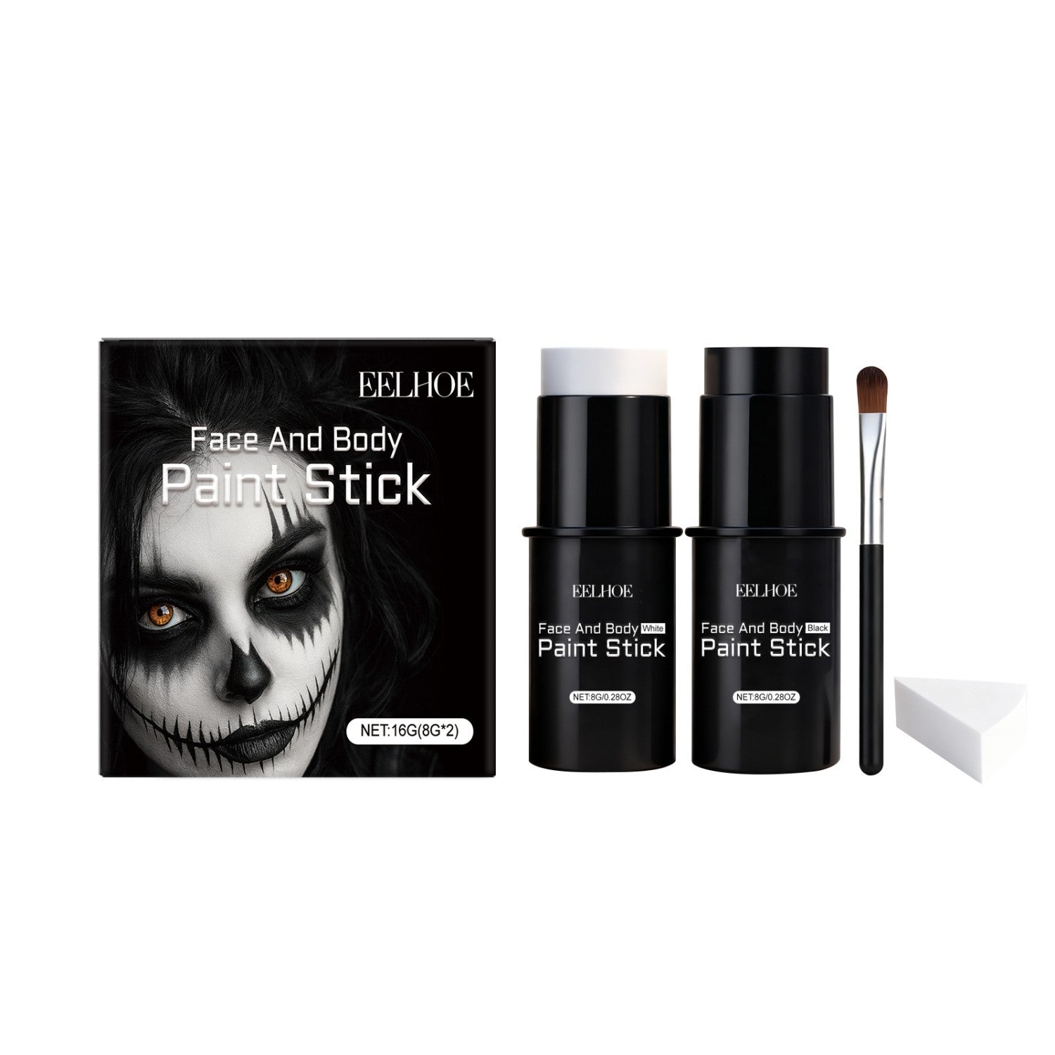 EELHOE face and body painting stick black: 8G*1, EELHOE face and body painting stick white: 8G*1, sponge *1, brush *1.