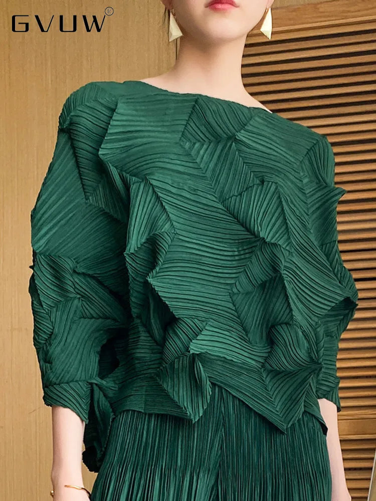 GVUW Elegant Diamond Pleated T-shirt Women Summer Fashion Three Quarter Sleeve O-neck Pullover Female Loose Clothing 17D585