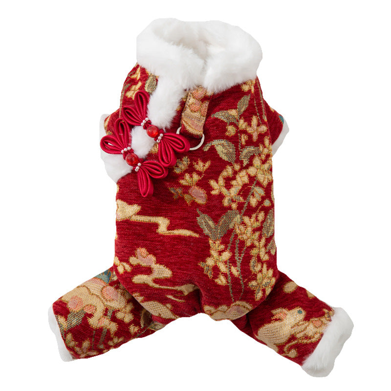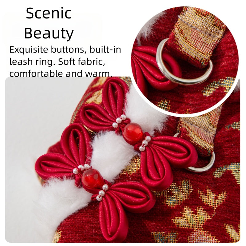 Celebrate Lunar New Year in style with this Exquisite Brocade Pet Jumpsuit! Available in red and beige brocade patterns, each jumpsuit features traditional Chinese knot buttons, plush faux fur trim, and intricate floral-gold motifs. The full-body design ensures warmth and comfort, while the cultural details make it perfect for festive gatherings or traditional events. Let your furry companion embrace the holiday spirit with elegance and authenticity, combining heritage, coziness, and trendiness in one irresistible outfit. A must-have for pet parents looking to infuse Lunar New Year traditions into their pet’s wardrobe!