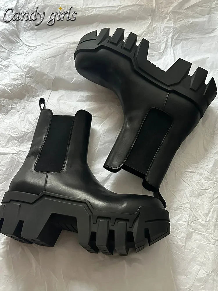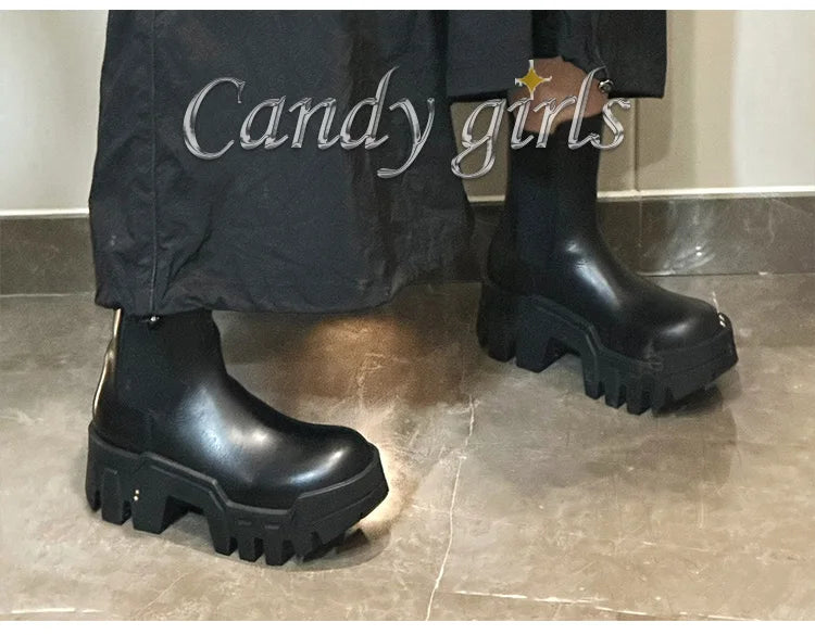 Retro Chelsea Mid-Calf for Women New round Toe Muffin Gear Platform Black Mid-Calf Length Motorcycle Boots