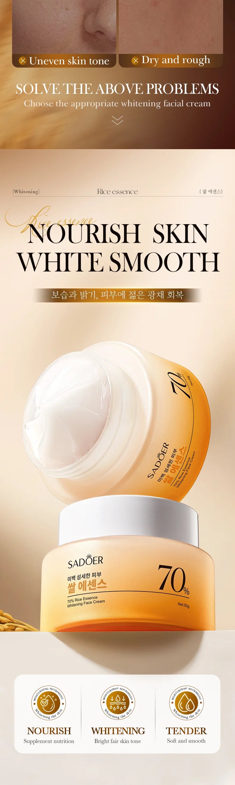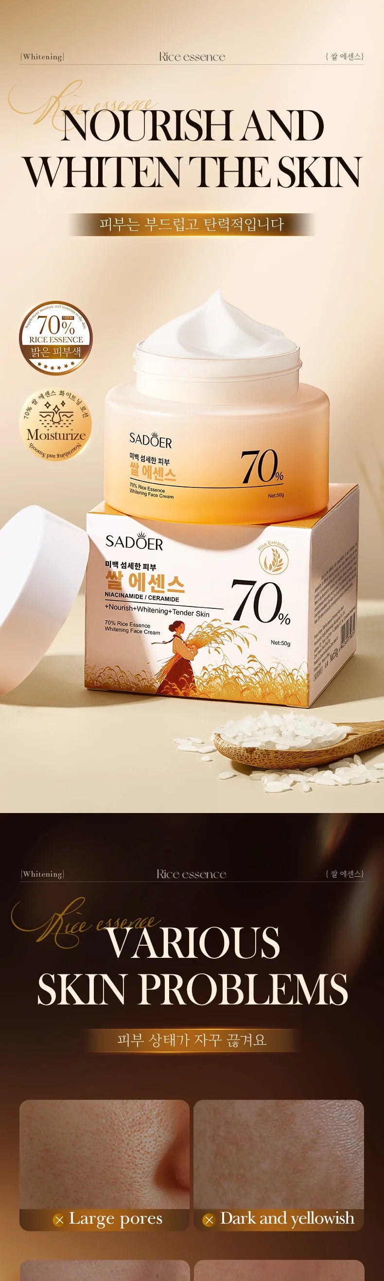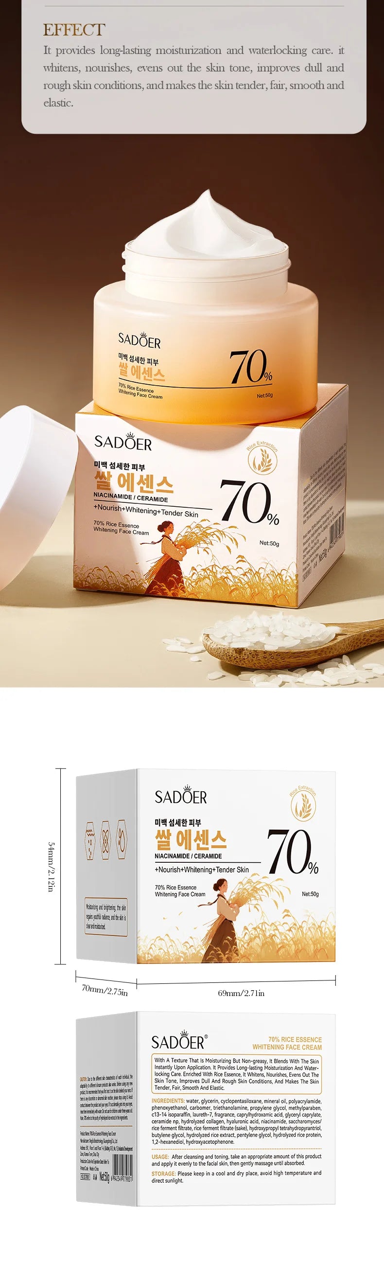 SADOER Rice Essence Face Cream Whitening Moisturizing Nourishing Anti-Aging Anti Wrinkle Facial Cream Korean Skin Care Cosmetics